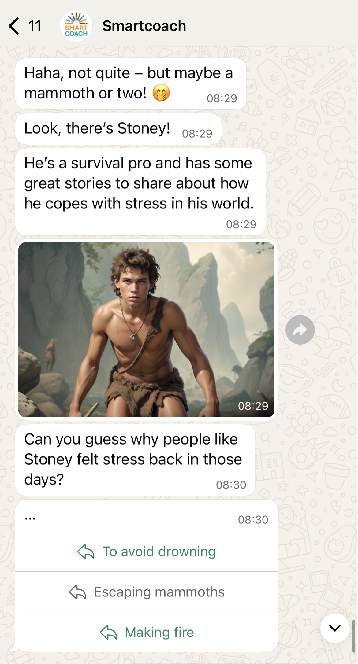 For a period of four months, the young people receive interactive coaching via WhatsApp. They accompany a Stone Age man in his struggle for survival, a cyborg learning human communication and a scientist researching addictive behaviour. In this way, they improve their stress resistance, social skills and resilience to addictive substances in a playful and entertaining way.